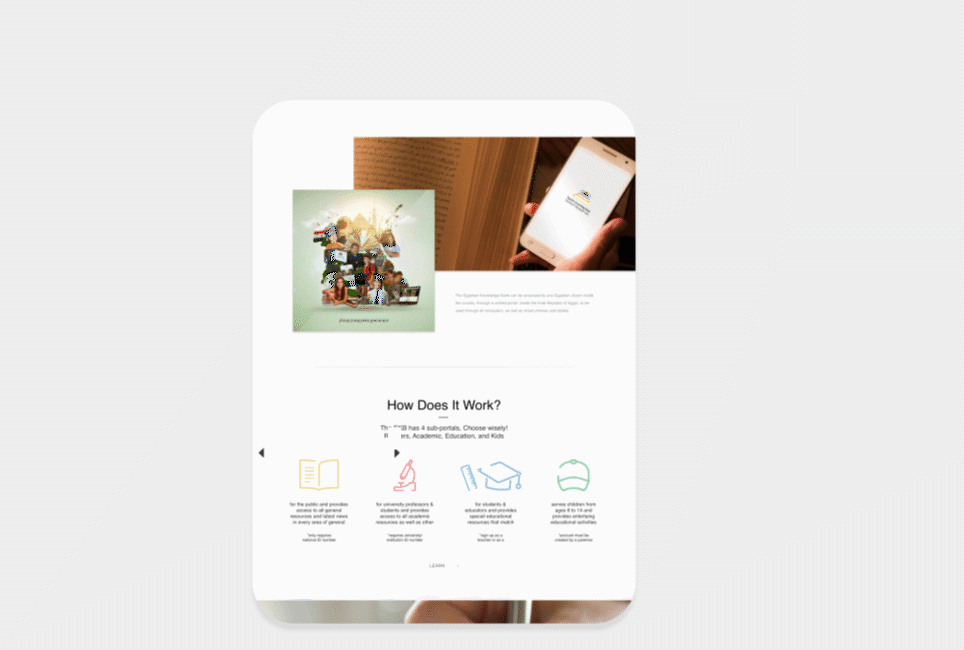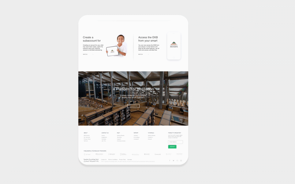 “Our goal is to provide all Egyptians with access to world-class publications. By providing these materials free of charge, the Egyptian Knowledge Bank ensures that all Egyptians, no matter what their economic circumstances, will have the tools they need to excel in their education and research.”-Dr Tarek Shawky The Egyptian Knowledge Bank can be accessed by any Egyptian citizen inside the country, through a unified portal, inside the Arab Republic of Egypt, to be used through all computers, as well as smart phones and tablets. We have proudly created an easy, accessible and fully functional web design used by all ages and educational stages.